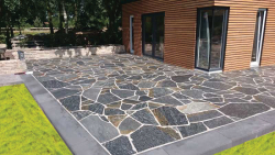 Farbe: Schwarz Blau mit Braunen Adern   Gestein: Quarzit  Oberfläche: Spaltrauh  Polygonalplatten  4 - 6 Platten pro m2  Stärke 4 - 6 cm  Herkunftsland: Griechenland