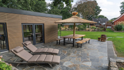 Farbe: Grün Braun  Gestein: Quarzit  Oberfläche: Spaltrauh  Polygonalplatten  4 - 6 Platten pro m2  Stärke 4 - 6 cm  Herkunftsland: Griechenland