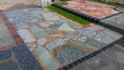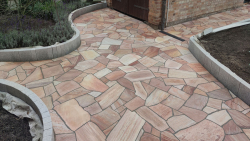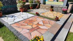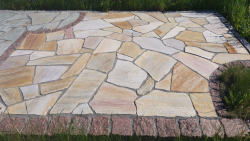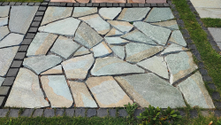 Farbe: Grün Braun Gestein: Quarzit Oberfläche: Spaltrauh Polygonalplatten 4 - 6 Platten pro m2 Stärke 4 - 6 cm Herkunftsland: Griechenland